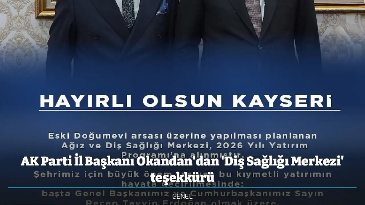 AK Parti Kayseri İl Başkanı Hüseyin Okandan, 2026 Yılı Yatırım Programına alınan Ağız ve Diş Sağlığı Merkezi için emeği geçenlere teşekkür etti.