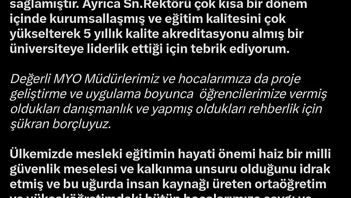 Cıngı yaptığı paylaşımda, 'Rektörümüz Prof. Dr. Kurtuluş Karamustafa'ya güzel ifadelerinden dolayı teşekkür ediyorum. Kendisi ilk andan itibaren bu sürece heyecanla sahip çıkmış ve öğrencilerin proje geliştirmesi için her türlü desteği sağlamıştır. Ayrıca Rektörü çok kısa bir dönem içinde kurumsallaşmış ve eğitim kalitesini çok yükselterek 5 yıllık kalite akreditasyonu almış bir üniversiteye liderlik ettiği için tebrik ediyorum. Değerli MYO Müdürlerimiz ve hocalarımıza da proje geliştirme ve uygulama boyunca öğrencilerimize vermiş oldukları danışmanlık ve yapmış oldukları rehberlik için şükran borçluyuz. Ülkemizde mesleki eğitimin hayati önemi haiz bir milli güvenlik meselesi ve kalkınma unsuru olduğunu idrak etmiş ve bu uğurda insan kaynağı üreten ortaöğretim ve yükseköğretimdeki bütün hocalarımıza saygı ve sevgilerimizi sunuyoruz. Start-Up MYO yarışmasına katılan ve hem kendisi hem de ülkemiz için kafa yorarak proje üretme başarısını gösteren tüm öğrencilerimizi de tebrik ediyor başarılar diliyoruz' ifadelerine yer verdi.