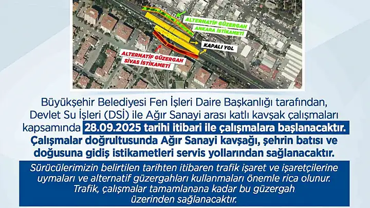 Kayseri Büyükşehir Belediyesi tarafından yapılan açıklamada, 'Kayseri Büyükşehir Belediyesi Fen İşleri Daire Başkanlığı tarafından, Devlet Su İşleri (DSİ) ile Ağır Sanayi arası katlı kavşak çalışmaları kapsamında 28 Eylül 2025 tarihi itibarıyla çalışmalara başlanacaktır. Yapılacak çalışmalar doğrultusunda Ağır Sanayi Kavşağı'nın şehrin batısı ve doğusuna gidiş istikametleri servis yolları üzerinden sağlanacaktır. Sürücülerimizin belirtilen tarihten itibaren trafik işaret ve işaretçilerine uymaları ve alternatif güzerghları kullanmaları önem arz etmektedir. Trafik akışı, çalışmalar tamamlanana kadar bu güzerghlar üzerinden sürdürülecektir. Vatandaşlarımızın mağduriyet yaşamamaları için gerekli düzenlemeler yapılmış olup, siz değerli basın mensuplarımız aracılığıyla kamuoyunun bilgilendirilmesi büyük önem taşımaktadır' ifadelerine yer verildi.