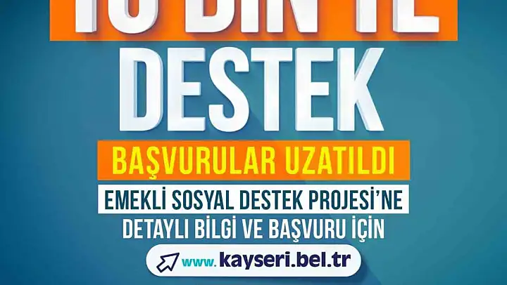 Kayseri Büyükşehir Belediyesi, dar gelirli emeklilere yönelik 10 bin TL'lik nakdi sosyal destek programında başvurular 4 Mayıs 2026 Pazartesi gününe kadar uzatıldı.