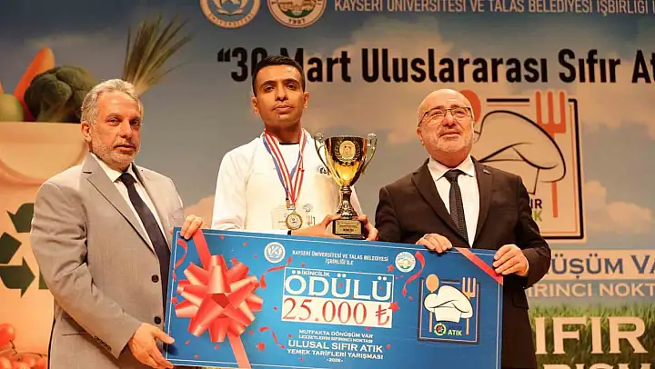 Talas Belediyesi ve KAYÜ tarafından 30 Mart Uluslararası Sıfır Atık Günü kapsamında gıda israfının önlenmesi, atıkların kaynağında ayrıştırılması ve çevre dostu üretim anlayışının yaygınlaştırılması amacıyla Mutfakta Dönüşüm Var-Ulusal Sıfır Atık Yemek Yarışması düzenlendi. Finalinde 9 üniversite öğrencisinin ter döktüğü yarışmada ilk 3'e giren öğrencilere KAYÜ Kongre ve Kültür Merkezi'nde düzenlenen program ile ödülleri verildi. Saygı duruşunda bulunulması ve İstiklal Marşı'nın okunmasının ardından törenin açılış konuşmasını yapan Talas Belediye Başkanı Mustafa Yalçın, gıdanın en önemli sektör olduğunu kaydederek, 'En önemli sektör gıda sektörüdür. Pandemi de 'herkes içeri girsin' denildi, yeme ve içme ihtiyacı bitmedi. Depremde 'herkes dışarı çıksın' denildi, yeme ve içme ihtiyacı yine bitmedi. Ülkemizde tarım ve hayvancılık olarak kendisine yetecek bir ülke. Dünyanın her tarafında gıda konusunda ki savurganlık ve israf diz boyu. Dünyanın 4'te 1'i açlıkla mücadele ederken, öbür tarafta obeziteyle alakalı tedavi peşinde koşuyor. Bizim kültürümüzde de bunların hepsini ortalayacak bilgi birikimi var' dedi.