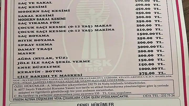Açıklanan fiyat listesine göre; saç ve sakal yıkama fön 700 TL, saç ve sakal 500 TL, saç kesimi 400 TL, modern saç kesimi 450 TL, sakal kesimi 250 TL, modern sakal kesimi 300 TL, saç yıkama fön 250 TL, çocuk saçı kesme (0-12 yaş) makas 260 TL, çocuk saçı kesme (0-12 yaş) makine 210 TL, saç boyama bin 500 TL, bıyık boyama 250 TL, sprey sıkma 200 TL, damat tıraşı 3 bin TL, maske 200 TL, ağda (kulak, yüz) 200 TL, jöle ile saça şekil verme 150 TL, ense düzeltme 150 TL, keratin-botox bin TL ve cilt bakımı ve maskesi de 375 TL oldu.