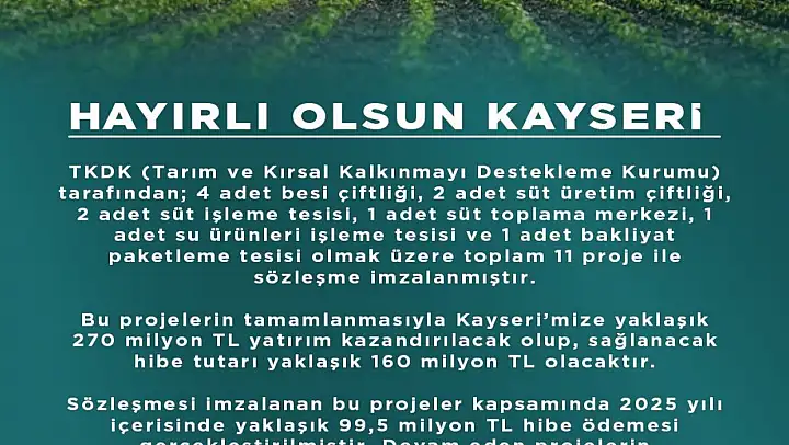 AK Parti Kayseri İl Başkanı Hüseyin Okandan açıklamasında; 'Tarım ve Kırsal Kalkınmayı Destekleme Kurumu tarafından 4 adet besi çiftliği, 2 adet süt üretim çiftliği, 2 adet süt işleme tesisi, 1 adet süt toplama merkezi, 1 adet su ürünleri işleme tesisi ve 1 adet bakliyat paketleme tesisi olmak üzere toplam 11 proje ile sözleşme imzalanmıştır. Bu projelerin tamamlanmasıyla Kayseri'mize yaklaşık 270 milyon TL yatırım kazandırılacak olup, sağlanacak hibe tutarı yaklaşık 160 milyon TL olacaktır. Sözleşmesi imzalanan bu projeler kapsamında 2025 yılı içerisinde yaklaşık 99,5 milyon TL hibe ödemesi gerçekleştirilmiştir. Devam eden projelerin tamamlanmasıyla birlikte 2026 yılı içerisinde yaklaşık 60 milyon TL daha hibe ödemesi yapılacaktır. Bu süreçte başta Milletvekilimiz Şaban Çopuroğlu olmak üzere emeği geçen herkese teşekkür ediyoruz' ifadelerini kullandı.