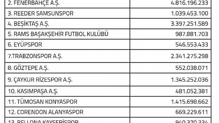 Türkiye Futbol Federasyonu (TFF) Kulüp Lisans Kurulu, 2024-2024 Sezonu Süper Lig takım harcama Limitlerini belirledi. Buna göre, yeni sezon için en çok harcama limiti Galatasaray'a verilirken en az limit ise Antalyaspor'a verildi. Kayserispor, en yüksek harcama limitine sahip 8. takım konumunda yer aldı. En çok harcama limiti alan Galatasaray için 6 milyar 137 milyon 773 bin TL belirlenirken, Kayserispor için ise 940 milyon 370 bin TL harcama limiti belirlendi.
