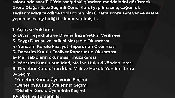 Kayserispor'dan konuyla ilgili yapılan açıklamada, 'Yönetim kurulumuz başkan ve üyelerin iştiraki ile toplanarak 21.02.2026 Cumartesi günü Kadir Has Kongre Merkezi Konferans salonunda saat 11.00'de gündem maddelerini görüşmek üzere Olağanüstü Seçimli Genel Kurul yapılmasına, çoğunluk sağlanamadığı takdirde toplantının bir (1) hafta sonra aynı yer ve saatte yapılmasına oy birliği ile karar verilmiştir' denildi.
