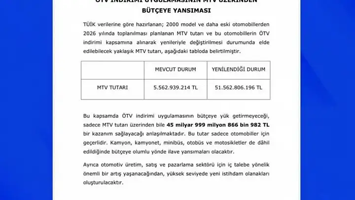 Özdemir, sosyal medya hesabından yaptığı paylaşımda, 'TBMM'ye sunduğumuz ve 2000 yılı öncesinde trafiğe kayıtlı araçların yerli üretim araçlarla yenilenmesini öngören kanun teklifimizle trafik güvenliğinin pekiştirilmesi, çevreci araçların teşvik edilerek kullanımının yaygınlaştırılması, ekonomik gelişmelere pozitif yönde katkı sağlanması hedeflerimizi ortaya koymuştuk. Teklifle ilgili bazı kamu kuruluşlarının olumlu yönde görüşe sahip olduğunu bilmekle beraber, ÖTV hususunda kayba neden olacağı endişelerinin ise yersiz bir yaklaşım olacağını ifade etmek gerekir. Zira ÖTV teşvikinin sağlanması ile oluşacak herhangi bir kayıp bulunmamaktadır. Aksine, kanunun gerçekleşmesi halinde ise bilhassa MTV gelirlerindeki yüksek artış sebebiyle bütçemize de olumlu yönde katkısı olacaktır. Bu yönüyle 2026 yılı içerisinde teklif ettiğimiz kanunun yasalaşması halinde merkezi bütçemize 45 milyar liradan fazla ilave bir kaynak sağlanmış olacaktır. Üstelik iç pazar hareketlenmesi ile otomotiv sektörü ve bağlı olan diğer alanlarda ilave istihdam da oluşturabilecektir. Vatandaşlarımızın ihtiyaç ve beklentisi çerçevesinde sunduğumuz kanun teklifimizin kabul edilerek, yürürlülüğe girmesi için gayretle çalışmalarımızı sürdürüyoruz' dedi.