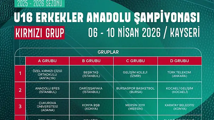 Türkiye U16 Erkekler Anadolu Şampiyonası Kırmızı Grup Maçları 06-10 Nisan tarihleri arasında Kayseri'de oynanacak.