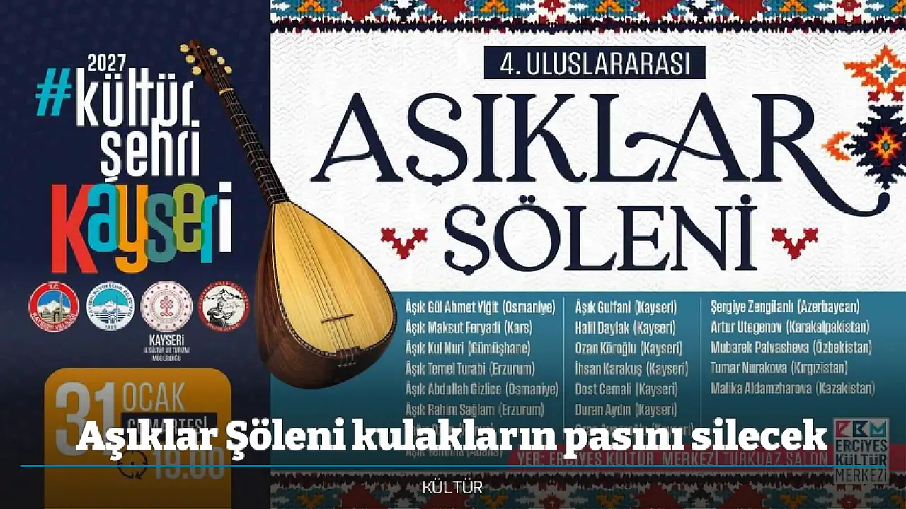 Kayseri Büyükşehir Belediyesi ve Kayseri Valiliği iş birliğinde Kayseri 4. Uluslararası Âşıklar Şöleni düzenleniyor. 31 Ocak Cumartesi günü saat 19.00'da Erciyes Kültür Merkezi'nde düzenlenecek şölende 7 şehir ve 5 ülkeden şıklar, Kayserilileri mest edecek.