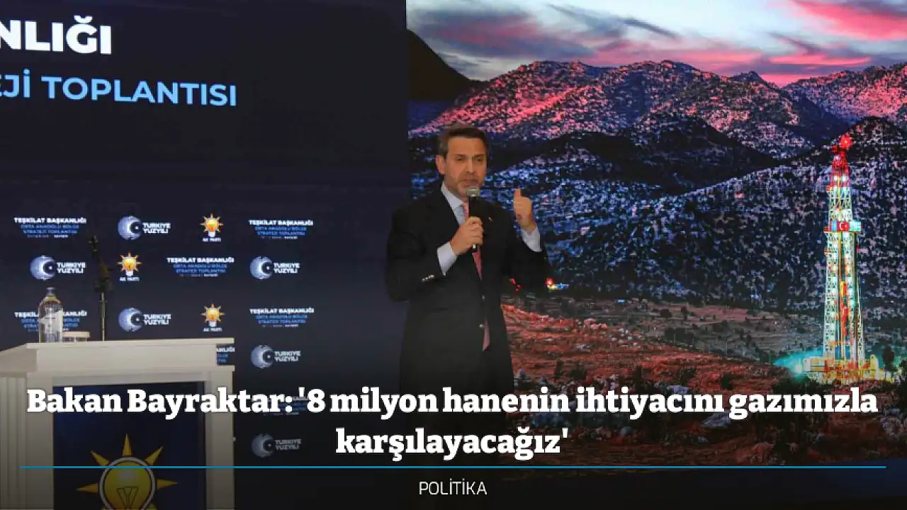 Kayseri'de düzenlenen Orta Anadolu Bölge Stratejisi Toplantısı'na katılan Enerji ve Tabii Kaynaklar Bakanı Alparslan Bayraktar Evlerimizde 4 milyon hanede keşfettiğimiz doğalgazı kullanır hale getirdik. Doğalgazda dışa bağımlılığımızı azaltmaya başladık. 2026 önemli bir yıl, inşallah bunu iki katına çıkaracağız ve 8 milyon hanenin ihtiyacını karşılayacağız dedi.