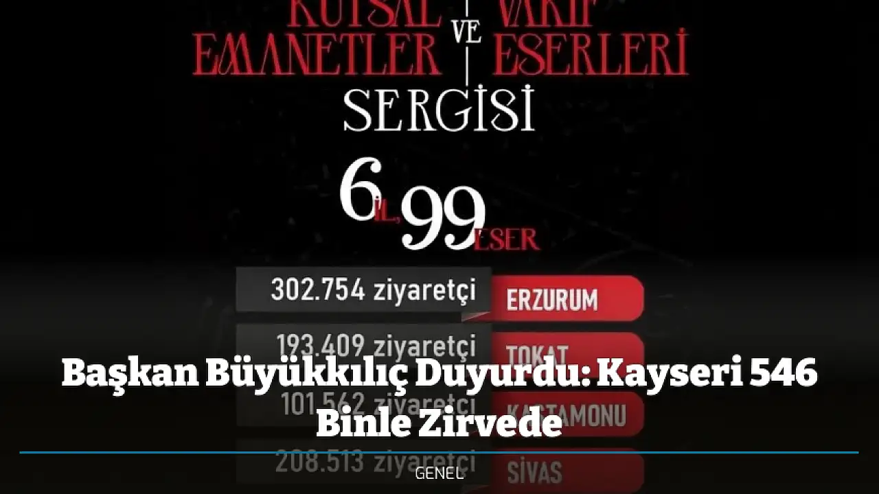 Kayseri’de ‘Kutsal Emanetler ve Vakıf Eserleri Sergisi’ne üç günde 546 bin 748 kişi akın etti. Büyükşehir Belediye Başkanı Dr. Memduh Büyükkılıç, Kayseri’nin 6 il arasında en çok ziyaretçiyi ağırlayarak kültürel gücünü bir kez daha ortaya koyduğunu vurguladı.