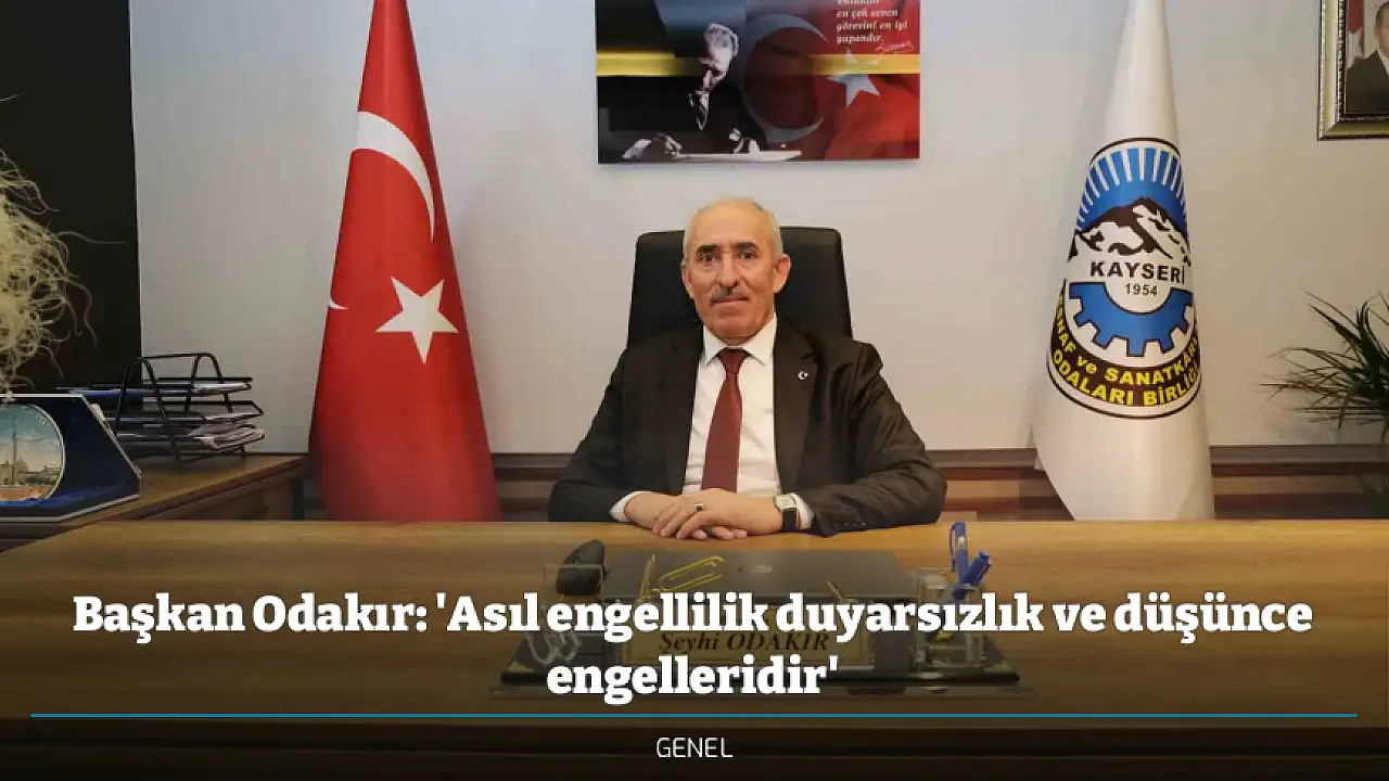 Kayseri Esnaf ve Sanatkârlar Odaları Birliği (KESOB) Başkanı Şeyhi Odakır, 3 Aralık Dünya Engelliler Günü dolayısıyla mesaj yayımladı. Başkan Odakır mesajında, asıl engelliliğin özel durumu olan insanlara karşı sergilenen duyarsızlık hali ve düşüncedeki engeller olduğunu belirtti.