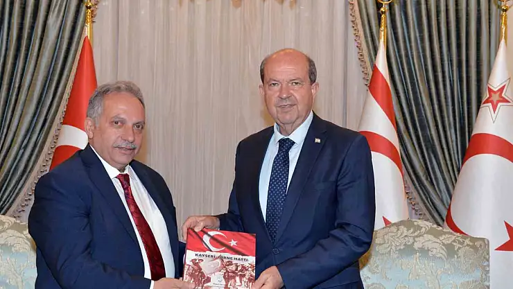 Talas Belediye Başkanı Mustafa Yalçın, KKTC Cumhurbaşkanları Ersin Tatar ve Derviş Eroğlu'na 'Kayseri Girne Hattı' kitabı takdim etti.