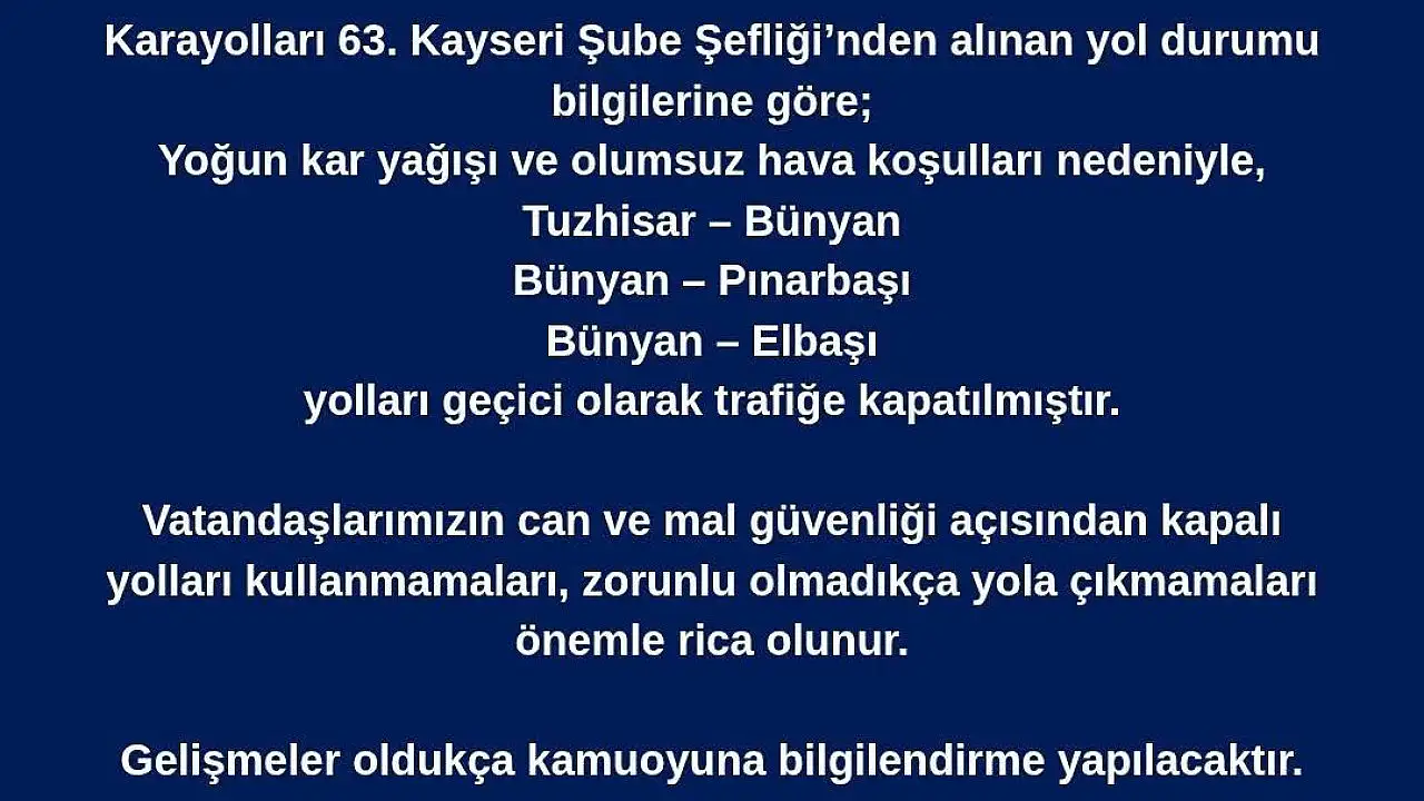 Başkan Selahattin Metin açıklamasında; "Karayolları 63. Kayseri Şube Şefliği’nden alınan yol durumu bilgilerine göre yoğun kar yağışı ve olumsuz hava şartları nedeniyle Tuzhisar - Bünyan, Bünyan - Pınarbaşı, Bünyan - Elbaşı yolları geçici olarak trafiğe kapatılmıştır. Vatandaşlarımızın can ve mal güvenliği açısından kapalı yolları kullanmamaları, zorunlu olmadıkça yola çıkmamaları önemle rica olunur" ifadelerini kullandı.