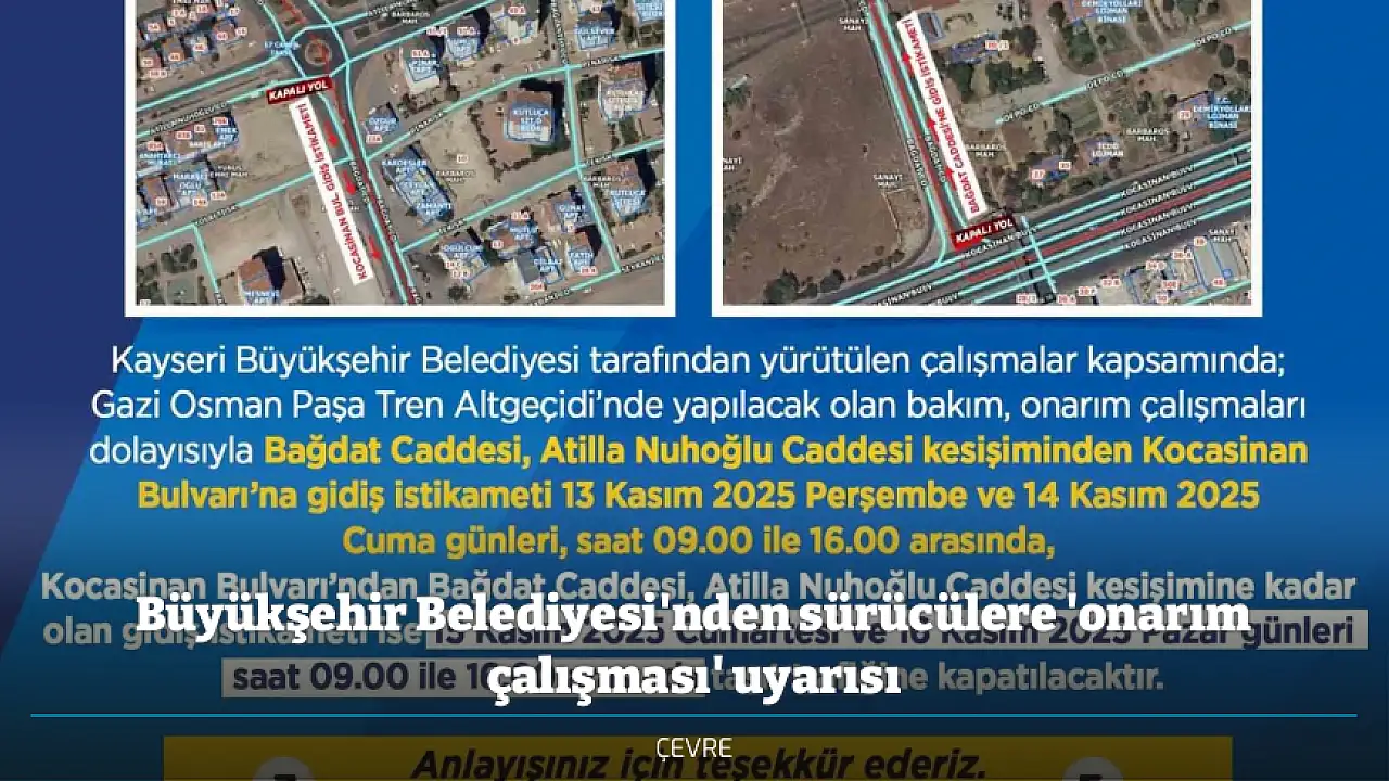 Kayseri Büyükşehir Belediyesi tarafından yapılan uyarıda, "Kayseri Büyükşehir Belediyesi tarafından yürütülen çalışmalar kapsamında; Gazi Osman Paşa Tren Altgeçidi’nde yapılacak olan bakım, onarım çalışmaları dolayısıyla Bağdat Caddesi, Atilla Nuhoğlu Caddesi kesişiminden Kocasinan Bulvarı’na gidiş istikameti 13 Kasım 2025 Perşembe ve 14 Kasım 2025 Cuma günleri, saat 09.00 ile 16.00 arasında, Kocasinan Bulvarı’ndan Bağdat Caddesi, Atilla Nuhoğlu Caddesi kesişimine kadar olan gidiş istikameti ise 15 Kasım 2025 Cumartesi ve 16 Kasım 2025 Pazar günleri saat 09.00 ile 16.00 arasında taşıt trafiğine kapatılacaktır" ifadelerine yer verildi.