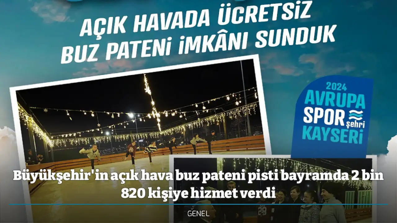 Kayseri Büyükşehir Belediyesi Spor A.Ş. tarafından Recep Tayyip Erdoğan Millet Bahçesi içerisinde hayata geçirilen Açık Hava Buz Pateni Pisti, bayramda 2 bin 820 kişiye hizmet verdi. 16 Mart'ta hizmete açılan tesis, açılışa özel olarak bayram boyunca vatandaşlara ücretsiz buz pateni yapma imknı sundu.