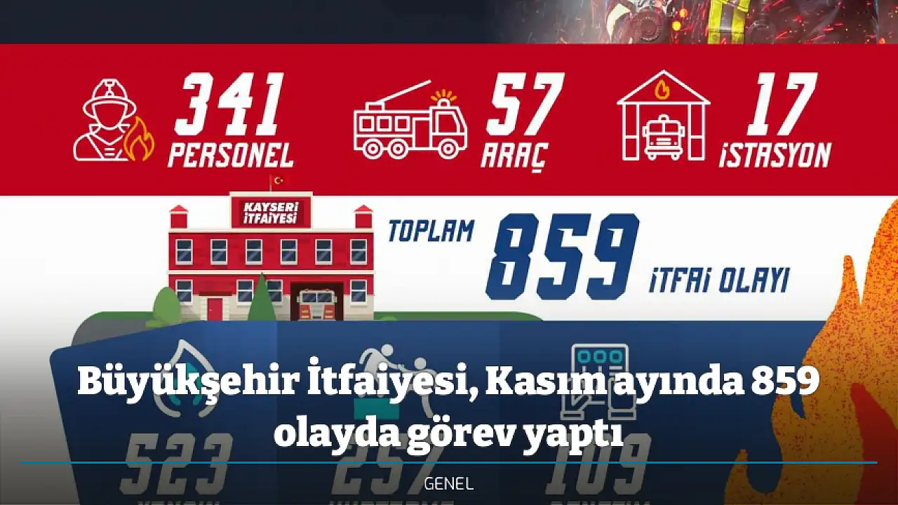 Kayseri Büyükşehir Belediyesi’nin 17 istasyon, 57 araç ve 341 personelden oluşan itfaiye teşkilatı, Kasım ayı boyunca 523 yangın, 257 kurtarma, 78 trafik kazası ve 1 su baskınına başarılı bir şekilde müdahale ederek toplamda 859 itfai olayda hızlı, etkin ve titiz bir şekilde görev yaptı.