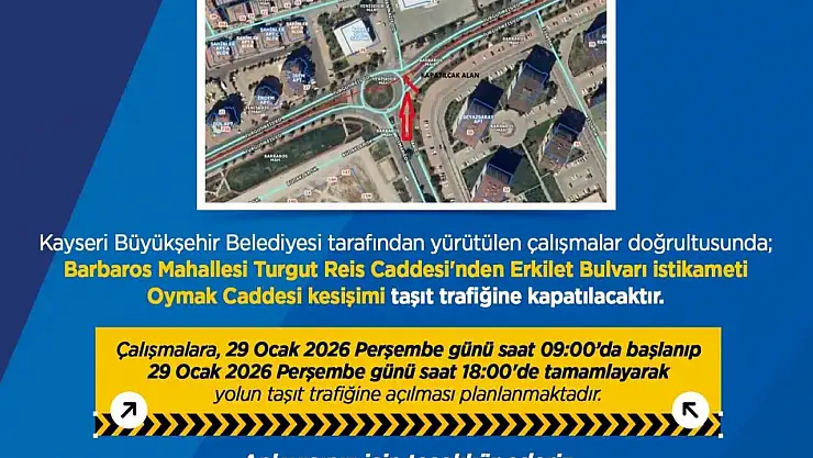 Kayseri Büyükşehir Belediyesi tarafından yapılan uyarıda, "Kayseri Büyükşehir Belediyesi tarafından yürütülen çalışmalar doğrultusunda Barbaros Mahallesi Turgut Reis Caddesi’nden Erkilet Bulvarı istikameti Oymak Caddesi kesişimi taşıt trafiğine kapatılacaktır. Çalışmalara 29 Ocak 2026 Perşembe günü saat 09:00’da başlanıp 29 Ocak 2026 Perşembe günü saat 18:00’de tamamlayarak yolun taşıt trafiğine açılması planlanmaktadır. Yapılan çalışmalar doğrultusunda Cırgalan Mahallesi’nden Buğdaylı Mahallesi’ne gidiş ve geliş Şehit Mehmet Erciyes Caddesi üzerindeki Buğdaylı köprüsü taşıt trafiğine kapatılacaktır. Çalışmalara 29 Ocak 2026 Perşembe günü saat 09:00’da başlanıp 29 Ocak 2026 Perşembe günü saat 18:00’de tamamlanarak yolun taşıt trafiğine açılması planlanmaktadır" ifadelerine yer verildi.