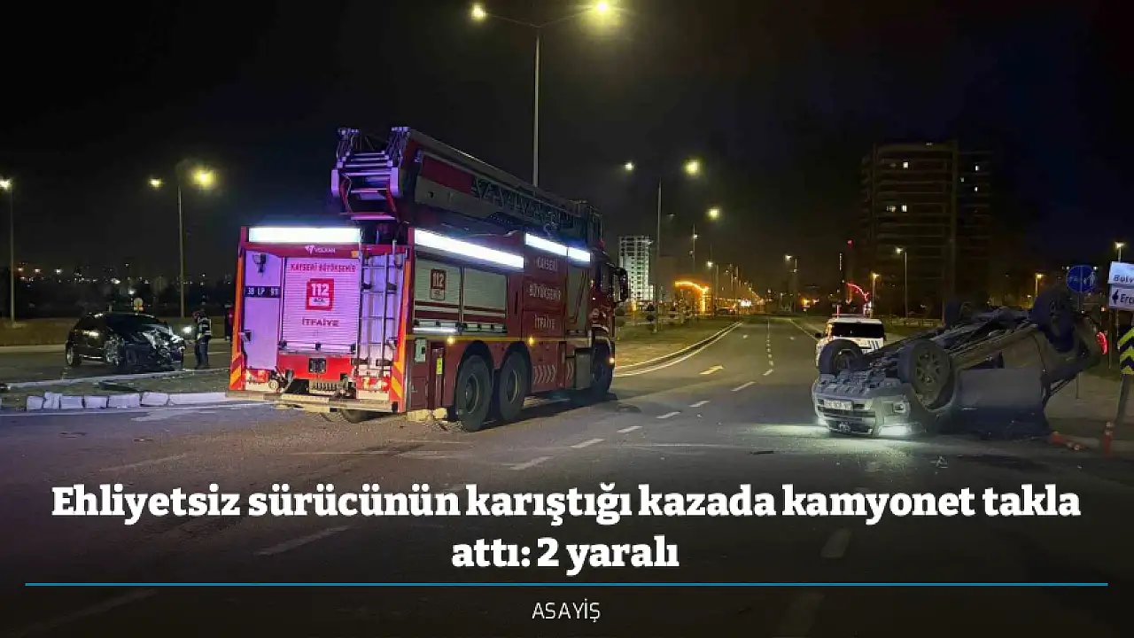 Edinilen bilgiye göre, ilçeye bağlı Germir Mahallesi Hulusi Akar Bulvarı üzerinde meydana gelen trafik kazasında M.A.E. yönetimindeki 38 ALC 809 plakalı otomobille M.E. yönetimindeki 38 AOB 346 plakalı kamyonet çarpıştı. Çarpışmanın etkisiyle kamyonet takla atarken, ihbar üzerine bölgeye polis, sağlık ve itfaiye ekipleri sevk edildi. Polis ekipleri yolda güvenlik önlemi alırken, sağlık ekipleri de yaptıkları ilk müdahalenin ardından kazada yaralanan sürücüler M.A.E. ve M.E.’yi ambulansla hastaneye kaldırdı. Öte yandan, ekipler tarafından yapılan kontrollerde otomobil sürücüsü M.A.E.’nin ehliyetsiz olduğu belirlendi. Çalışmaların ardından otomobil ve kamyonet çekiciyle kaldırıldı.