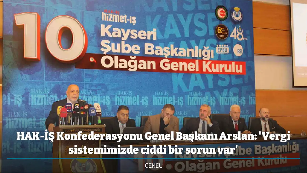 Hizmet-İŞ Sendikası Kayseri Şubesi’nin 10. Olağan Genel Kurulu’na katılan Hak-İş Konfederasyonu Genel Başkanı ve Hizmet-İş Sendikası Genel Başkanı Mahmut Arslan; "Verginin adil olması gerekiyor. Bizim vergi sistemimizde ne yazık ki ciddi bir sorun var" dedi.