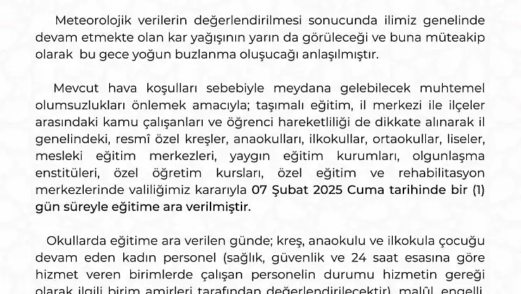 Kayseri Valiliği’nden yapılan açıklamada, "Meteorolojik verilerin değerlendirilmesi sonucunda ilimiz genelinde devam etmekte olan kar yağışının yarın da görüleceği ve buna müteakip olarak bu gece yoğun buzlanma oluşucağı anlaşılmıştır. Mevcut hava şartları sebebiyle meydana gelebilecek muhtemel olumsuzlukları önlemek amacıyla; taşımalı eğitim, il merkezi ile ilçeler arasındaki kamu çalışanları ve öğrenci hareketliliği de dikkate alınarak il genelindegenelindeki resmî özel kreşler, anaokulları, ilkokullar, ortaokullar, liseler, mesleki eğitim merkezleri, yaygın eğitim kurumları, olgunlaşma enstitüleri, özel öğretim kursları, özel eğitim ve rehabilitasyon merkezlerinde valiliğimiz kararıyla 7 Şubat 2025 Cuma tarihinde 1 gün süreyle eğitime ara verilmiştir. Okullarda eğitime ara verilen günde; kreş, anaokulu ve ilkokula çocuğu devam eden kadın personel (sağlık, güvenlik ve 24 saat esasına göre hizmet veren birimlerde çalışan personelin durumu hizmetin gereği olarak ilgili birim amirleri tarafından değerlendirilecektir), malul, engelli, ağır kronik rahatsız ve hamile kamu çalışanları da idari izinli sayılacaktır" ifadelerine yer verildi.