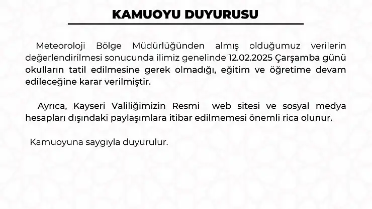 "Meteoroloji Bölge Müdürlüğünden almış olduğumuz verilerin değerlendirilmesi sonucunda ilimiz genelinde 12.02.2025 Çarşamba günü okulların tatil edilmesine gerek olmadığı, eğitim ve öğretime devam edileceğine karar verilmiştir. Ayrıca, Kayseri Valiliğimizin resmi web sitesi ve sosyal medya hesapları dışındaki paylaşımlara itibar edilmemesi önemli rica olunur. Kamuoyuna saygıyla duyurulur."