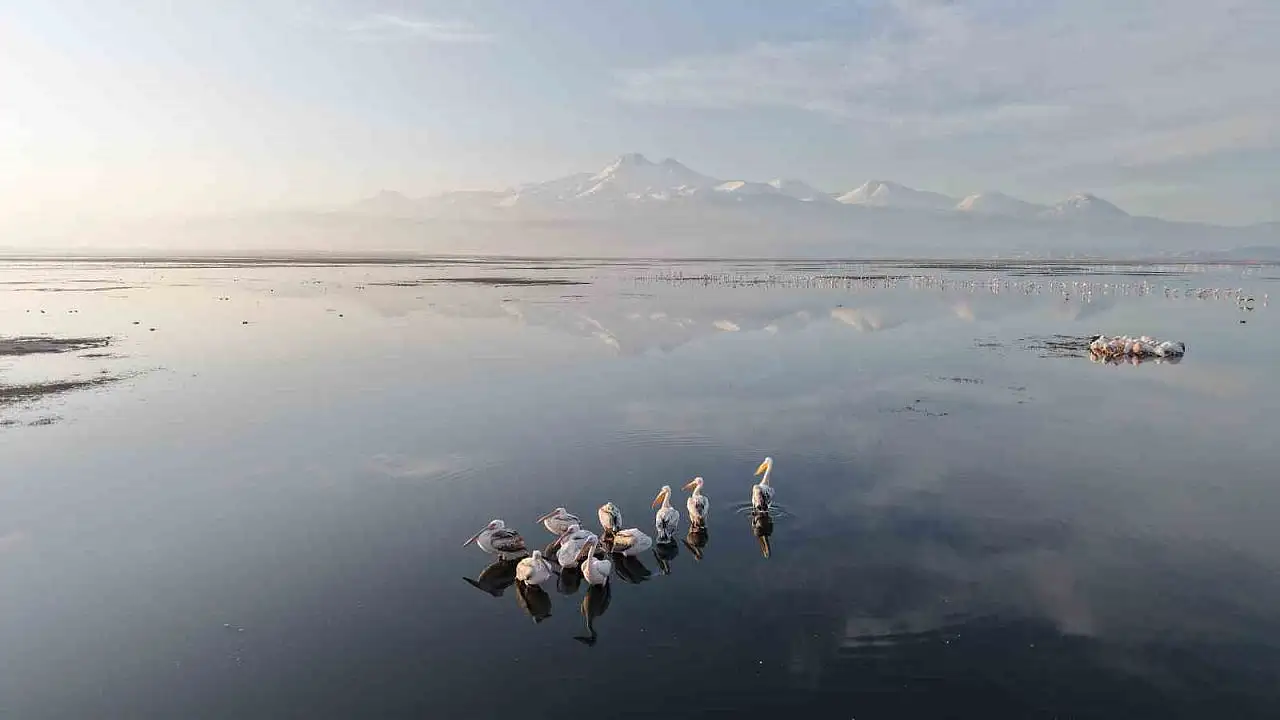 Baharın gelmesiyle birlikte Kayseri’ye adım atan ilk pelikan grubu dronla görüntülendi.