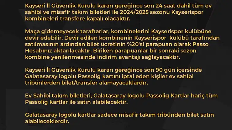 Süper Lig’in 17. haftasında oynanacak Kayserispor-Galatasaray maçının bilet fiyatları belli oldu. Kayserispor Kulübü tarafından belirlenen bilet fiyatları, bin 500 TL ile 3 bin 350 TL arasında değişiyor. Kayserispor Kulübü’nden yapılan açıklamada, “Şehrin Kalbinde buluşuyoruz. Bellona Kayserispor’umuzun Trendyol Süper Lig 2024-2025 Sezonu 17. haftasında 22 Aralık Pazar günü saat 16.00’da Galatasaray ile RHG Enertürk Enerji Stadyumu’nda oynayacağı karşılaşmanın biletleri Passolig tarafından satışa sunulmuştur. Detaylar Kayseri İl Güvenlik Kurulu kararı gereğince son 24 saat dâhil tüm ev sahibi ve misafir takım biletleri ile 2024/2025 sezonu Kayserispor kombineleri transfere kapalı olacaktır. Maça gidemeyecek taraftarlar, kombinelerini Kayserispor kulübüne devir edebilir. Devir edilen kombinenin Kayserispor kulübü tarafından satılmasının ardından bilet ücretinin yüzde 20’si para puan olarak Passo Hesabınız aktarılacaktır. Biriken para puanlar bir sonraki sezon kombine yenilenmesinde indirim avantajı sağlayacaktır. Kayseri İl Güvenlik Kurulu kararı gereğince son 90 gün içerisinde Galatasaray logolu Passolig kartını iptal eden kişiler ev sahibi tribünlerden bilet/transfer alamayacaklardır. Ev Sahibi takım biletleri, Galatasaray logolu Passolig Kartlar hariç tüm Passolig kartlar ile satın alabilecektir. Galatasaray logolu kartlar sadece misafir takım tribünden bilet satın alabileceklerdir. Galatasaray misafir tribün biletleri daha sonra satışa sunulacaktır” denildi.