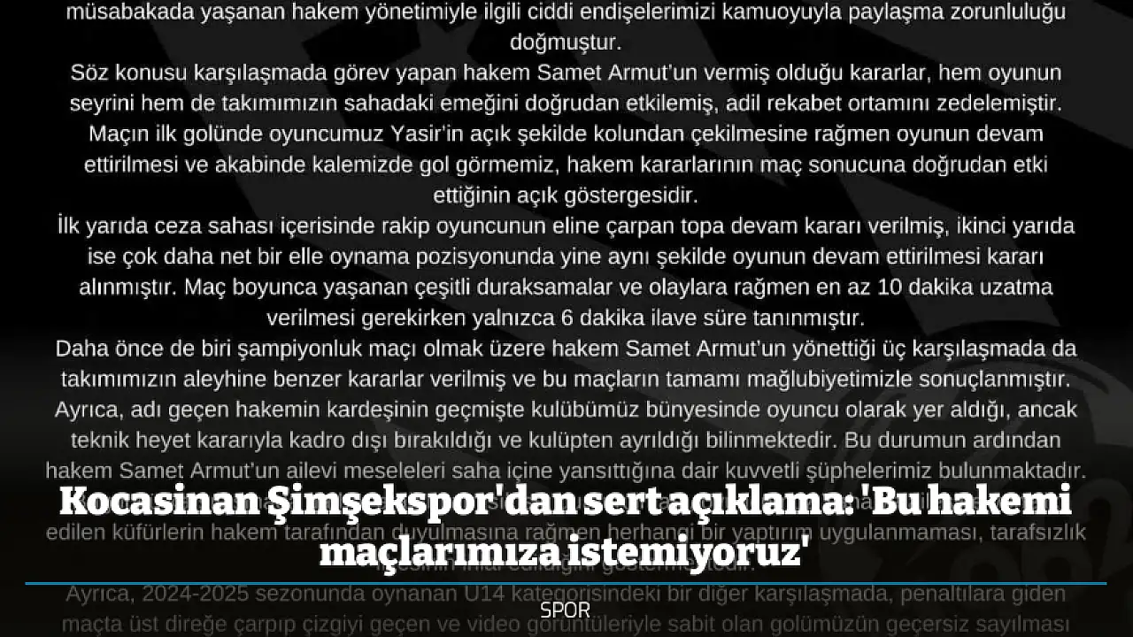 Kocasinan Şimşekspor Yönetim Kurulu; yaptığı açıklama ile Hakem SametArmut’un bir daha kendi maçlarında görevlendirilmemesini istedi.