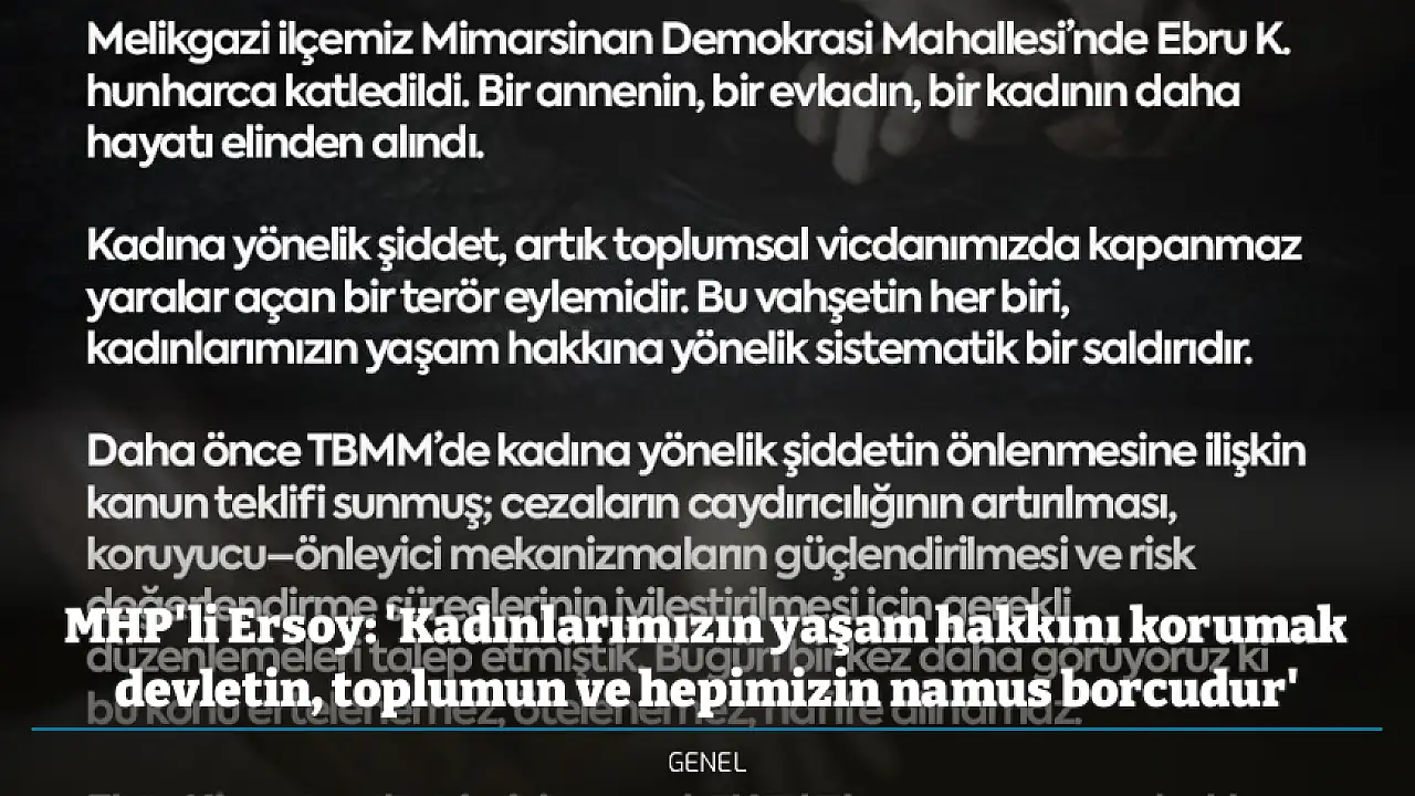 - MHP'li Ersoy: 'Kadınlarımızın yaşam hakkını korumak devletin, toplumun ve hepimizin namus borcudur'