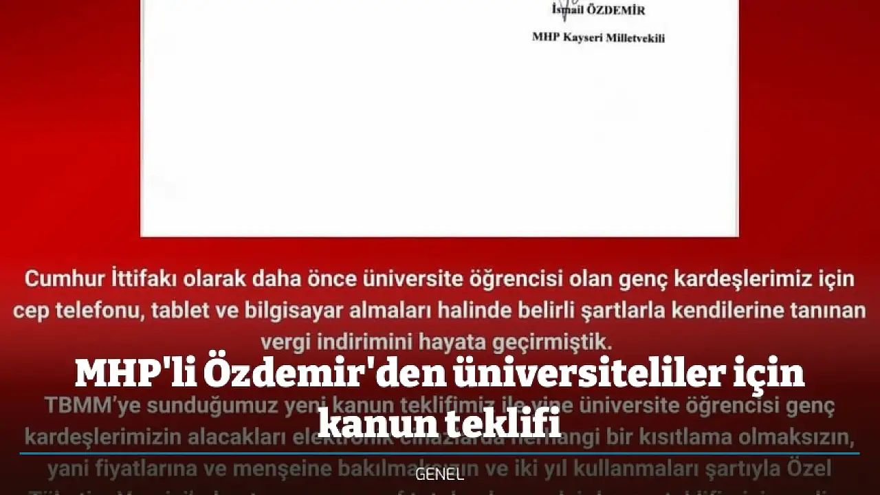 Milliyetçi Hareket Partisi (MHP) Genel Başkan Yardımcısı ve Kayseri Milletvekili İsmail Özdemir, sosyal medya hesabından yaptığı paylaşımla üniversite öğrencilerinin elektronik cihazlarda ÖTV'den muaf tutulmaları için kanun teklifini meclise sunduklarını duyurdu.