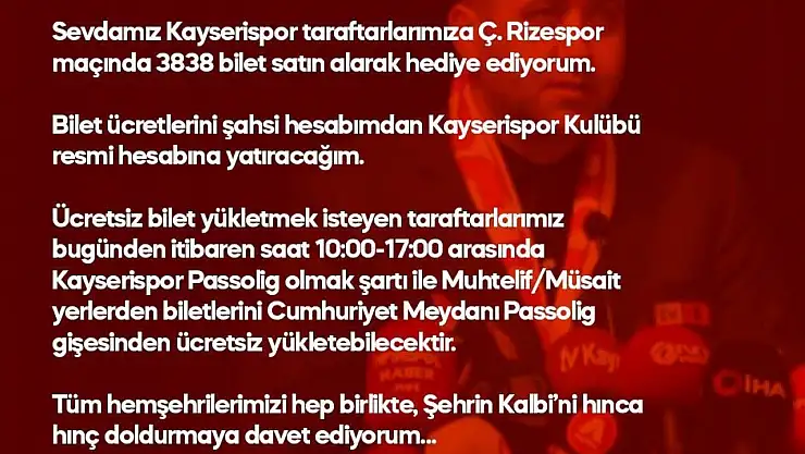 Milliyetçi Hareket Partisi (MHP) Kayseri Milletvekili Baki Ersoy, Kayserispor-Rizespor maçı için 3838 bilet dağıtacağını duyurdu.