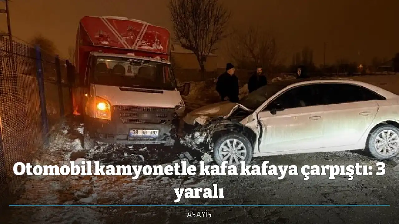 Edinilen bilgiye göre, ilçeye bağlı Cırgalan Mahallesi 4114. Sokak’ta meydana gele trafik kazasında, M.D. yönetimindeki 34 DAN 527 plakalı otomobille F.S. yönetimindeki 38 BB 887 plakalı kamyonet kafa kafaya çarpıştı. İhbar üzerine bölgeye polis ve sağlık ekipleri sevk edildi. Polis ekipleri yolda güvenlik önlemi alırken, sağlık ekipleri de kazada yaralanan sürücüler M.D. ve F.S. ile otomobilde bulunan yolcu M.S.T.’yi ambulansla hastaneye kaldırdı. Ekipler tarafından yapılan çalışmaların ardından otomobil ve kamyonet çekiciyle kaldırıldı.