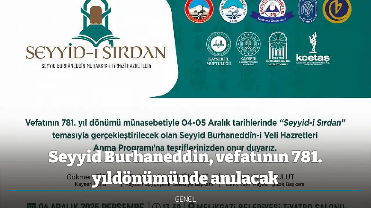 Kayseri Büyükşehir Belediyesi, Kayseri Valiliği ve Birlik Vakfı iş birliğinde Seyyid Burhaneddin'in 781. vefat yıl dönümü dolayısıyla 4-5 Aralık tarihlerinde 'Seyyid-i Sırdan' temasıyla Anma Programı düzenlenecek.