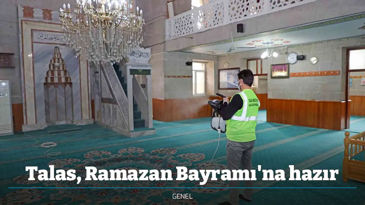 Bayram öncesi ilk olarak camilerde geniş kapsamlı bir çalışma gerçekleştiren Talas Belediyesi, camilerin genel temizliğine ek olarak virüslere karşı da ilaçlama yaptı. Bununla birlikte halılar süpürüldü, kitaplıklardan mihraplara kadar her yer detaylı şekilde temizlendi. Ayrıca bayram namazına hazırlanan camilere gül kokusu sıkıldı.