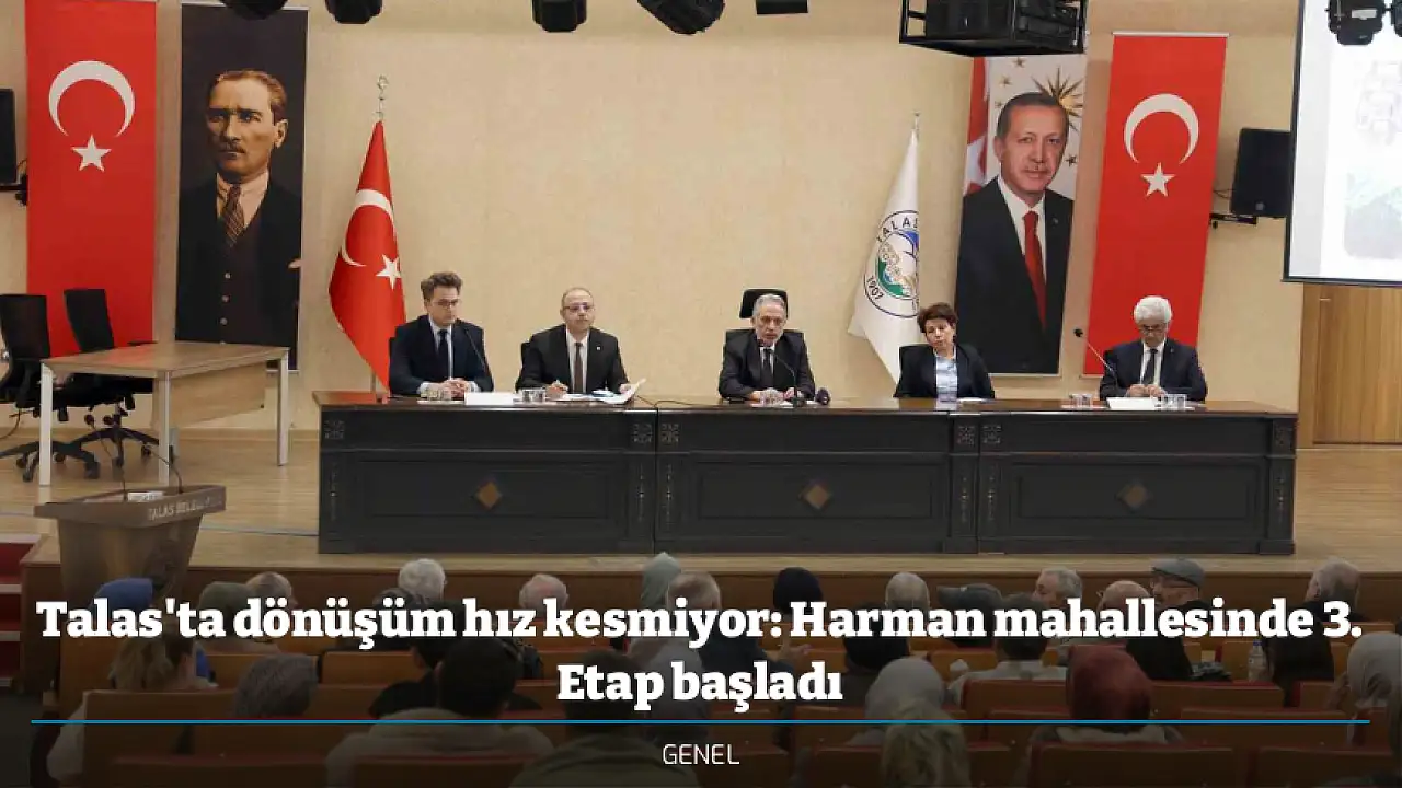 Talas Belediyesi tarafından Harman Mahallesi'nde yürütülen kentsel dönüşüm çalışmalarının 3. etabı, Belediye Meclis Salonu'nda düzenlenen bilgilendirme toplantısıyla kamuoyuna duyuruldu. Hak sahiplerinin yoğun katılım gösterdiği toplantıda, proje süreci tüm detaylarıyla ele alındı.