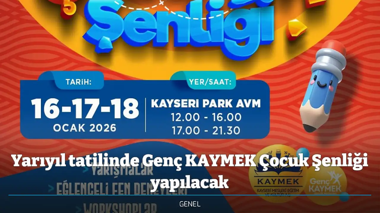 Eğitim hizmetlerinin yanı sıra sosyal, sanatsal ve kültürel etkinlikler, geziler, farkındalık projeleri, seminerler ve yarışmalarla birçok gencin geleceğine imza atan Büyükşehir Belediyesi bünyesindeki Genç KAYMEK, 16 Ocak 2026 Cuma günü saat 15.00’te Kayseri Park AVM -1. katında açılışı gerçekleşmek üzere saat 12.00-21.30 arasında 16, 17 ve 18 Ocak 2026 tarihlerinde 3 gün sürecek etkinliklere imza atıyor. Yarıyıl tatilinde öğrencilerin eğlenmesi ve tatilin tadını çıkarması amacıyla düzenlenen şenlikte, sanatsal workshop etkinlikleri, halat çekme yarışmaları, bilmeceler, çuval yarışmaları, bebek kimde yarışması, anne-çocuk tanıma yarışmaları, sandalye kapmaca yarışmaları, resim yapma ve boyama etkinlikleri, yüz boyama etkinlikleri, çocuk şarkıları ve dansları, eğlenceli fen deneyleri ile çocuklara özel sürpriz hediyelerin yer aldığı renkli ve eğlenceli birçok etkinlik yer alacak.