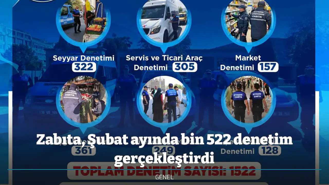 Kayseri Büyükşehir Belediyesi Zabıta Daire Başkanlığı ekipleri Şubat ayında 1522 denetim gerçekleştirerek kentte huzur, düzen ve güvenliğin tesis edilmesine katkı sağladı.